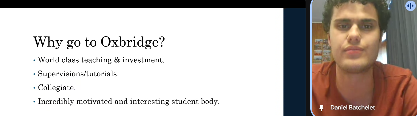 Former student Daniel Batchelet returned virtually to share valuable advice and guidance with students considering applying to Oxbridge.