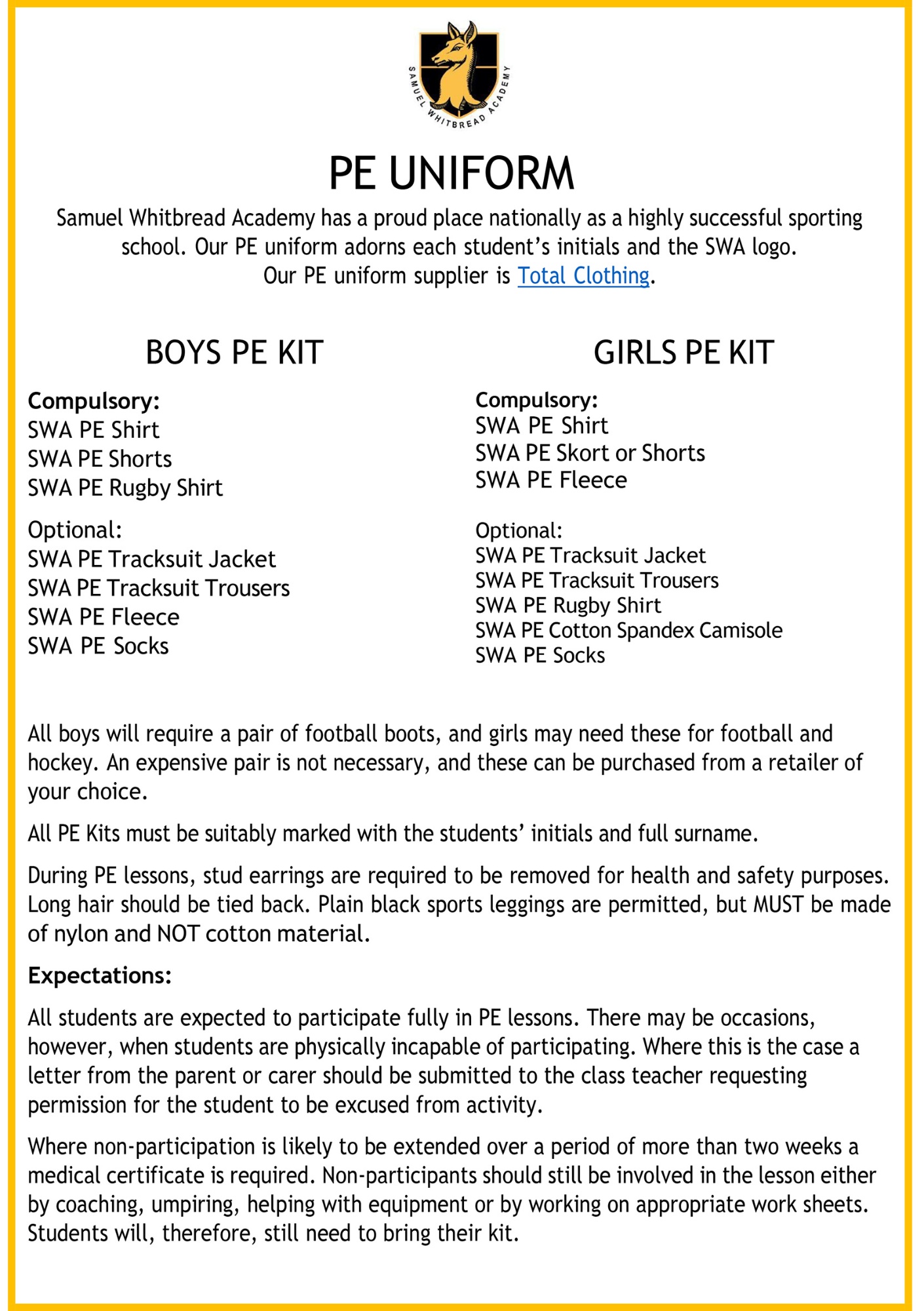 • Please see below for the number of options for uniform. Our uniform provider for general school and PE uniform is Total Clothing.
